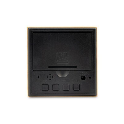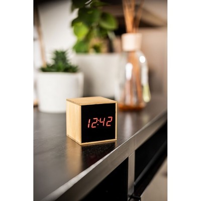 Stylish and eco-friendly bamboo desk clock with LCD display. Powered by a USB cable (included) or 3 AAA batteries for temporary use (not included). A built-in CR2032 battery (included) keeps your settings saved when disconnected. Functions include time, date, temperature, and up to 3 customizable alarms. Perfect for modern workspaces or home offices.
