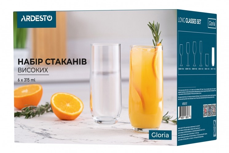 Ardesto Long glasses set Gloria 315 ml, 6 pcs, glass