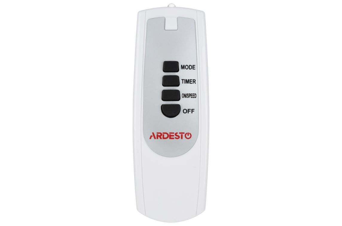 თეთრი ფერის დასადგამი ვენტილატორი დისტანციური მართვის პულტით და მრგვალი საყრდენით. მოდელი დამზადებულია საიმედო, პრაქტიკული და გამძლე მასალისგან.