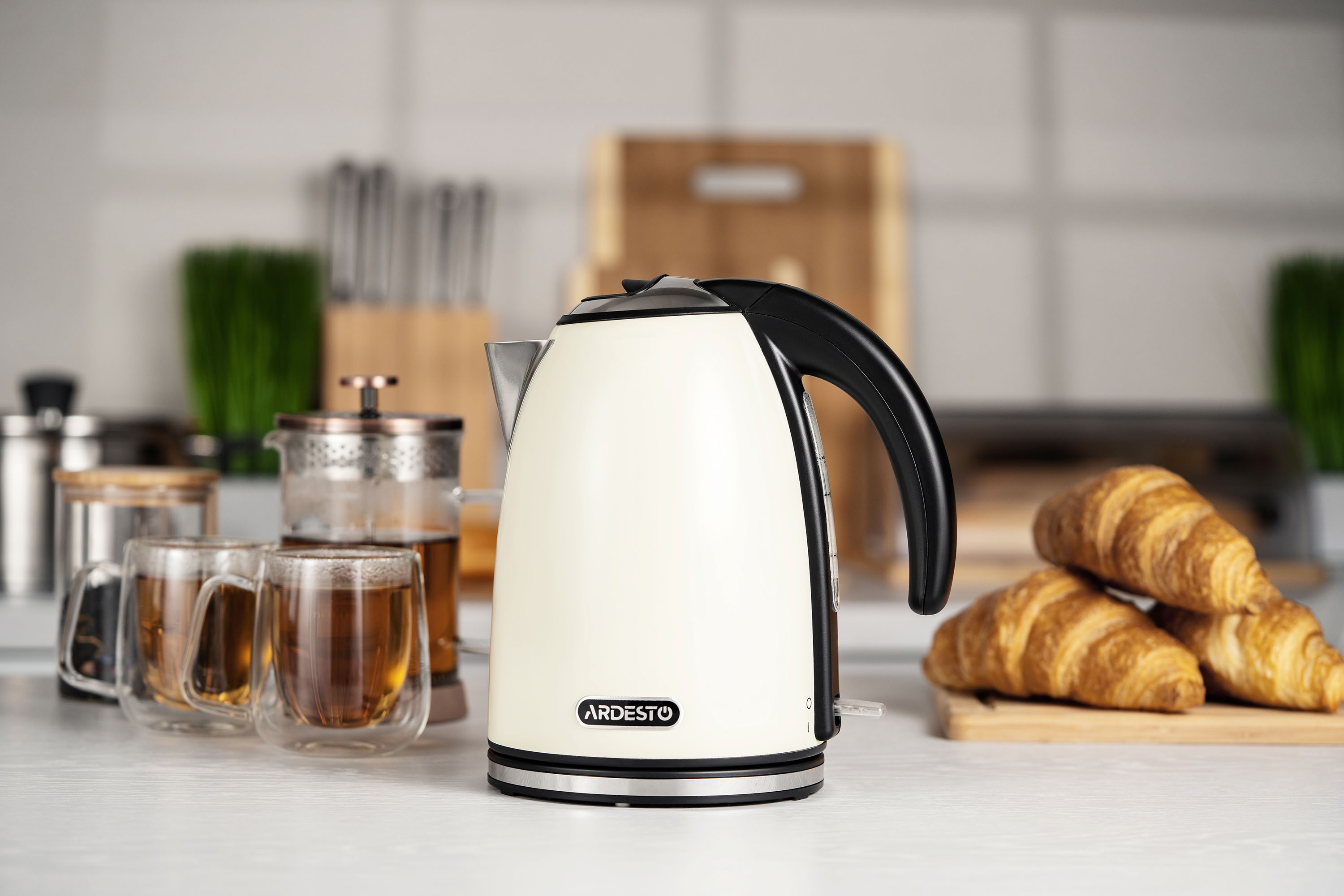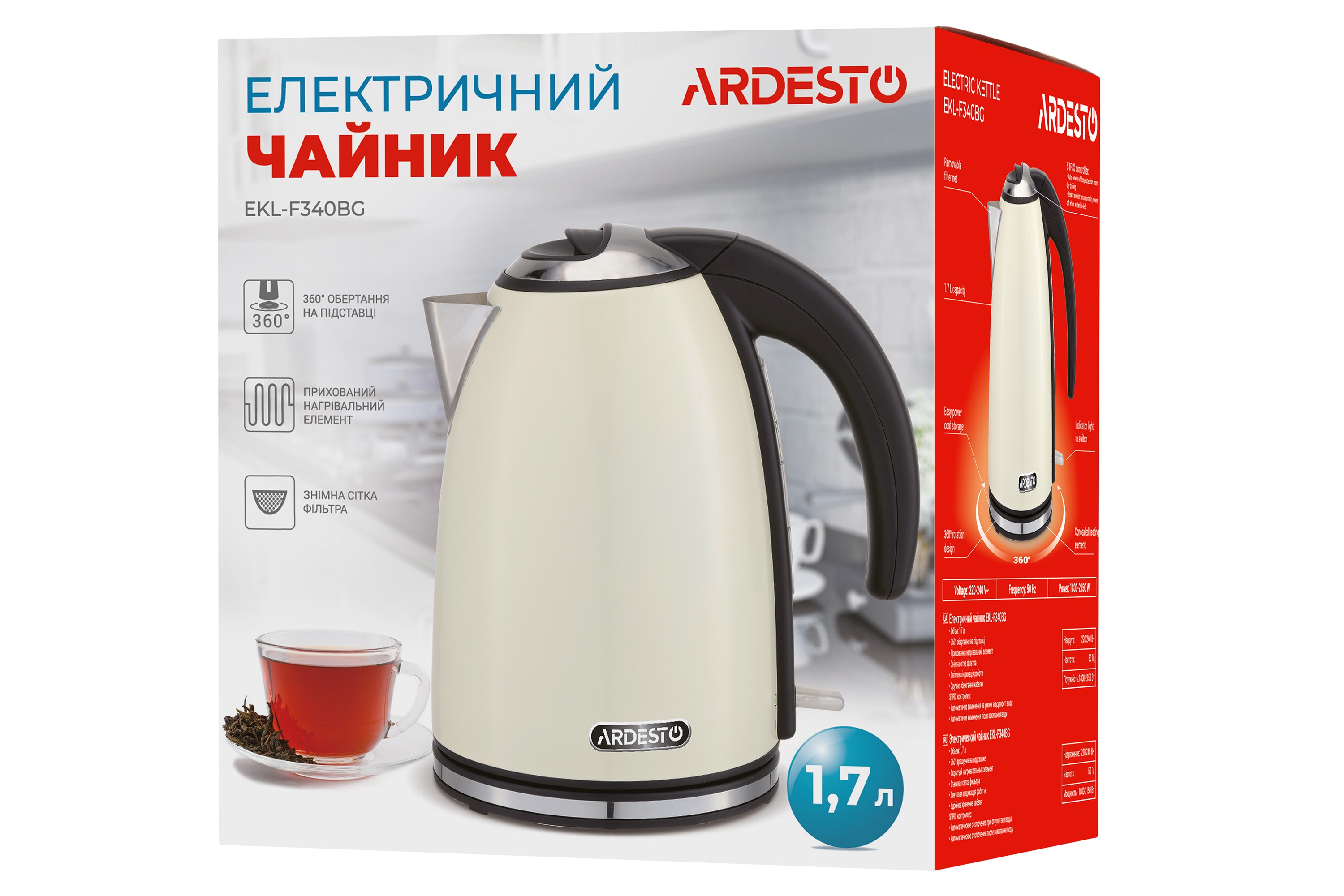 Ardesto EKL-F340BG ელექტრო ჩაიდანი დამზადებულია უჟანგავი ფოლადისგან. ჩაიდანის მოცულობაა 1.7 ლიტრი. სადგამი ბრუნავს 360°-ით. მოდელი აღჭურვილია ბრიტანული Strix კონტროლერით. მოწყობილობის სიმძლავრეა 2 200 ვატი. გამათბობელი ელემენტი დამალულია, სახელური ერგონომიულია. ავტომატურად ითიშება წყლის არარსებობის შემთხვევაში ან ადუღების შემდეგ. მას აქვს მოსახსნელი ნადების ფილტრი. მოდელი აღჭურვილია გადართვის ღილაკზე არსებული სინათლის ინდიკატორით და მოსახერხებელი წყლის დონის შკალით.