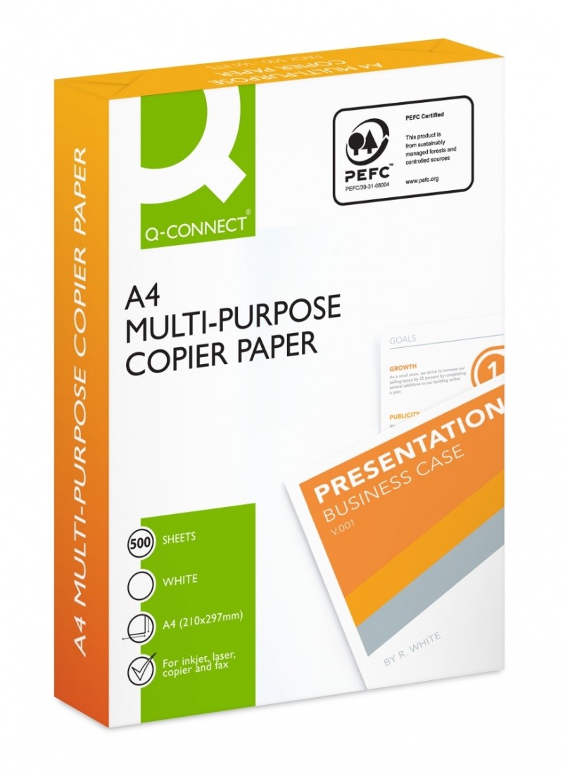 A4 საბეჭდი ქაღალდი Q-CONNECT 75გრ. 500 ფურც. სითეთრე - 146CIE, სისქე - 104მკ. C კლასი