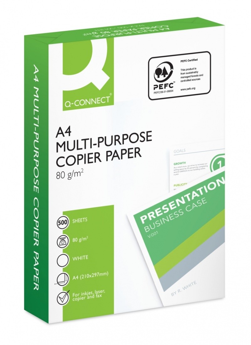 A4 საბეჭდი ქაღალდი Q-CONNECT 80 გრ. 500 ფურც. სითეთრე - 161CIE, სისქე - 108მკ. B კლასი
